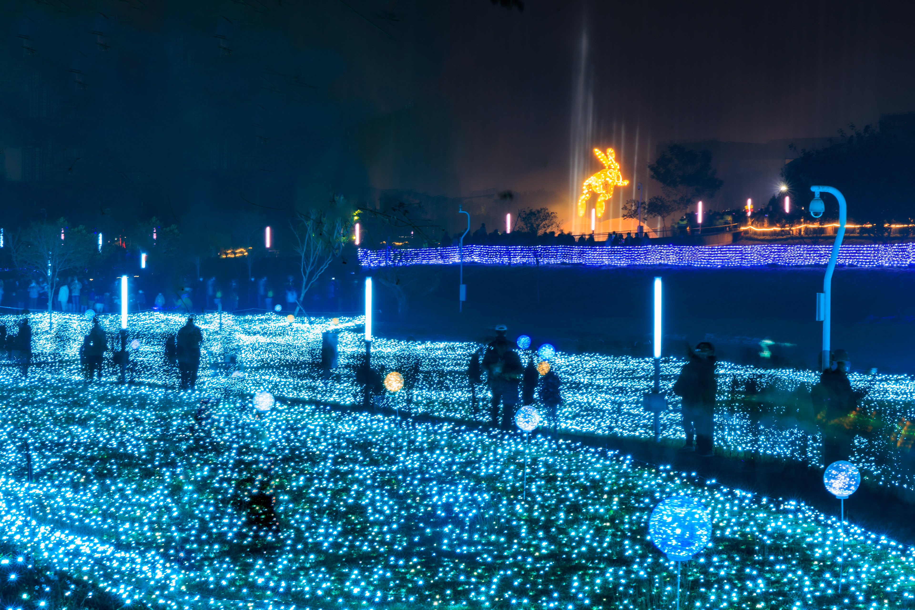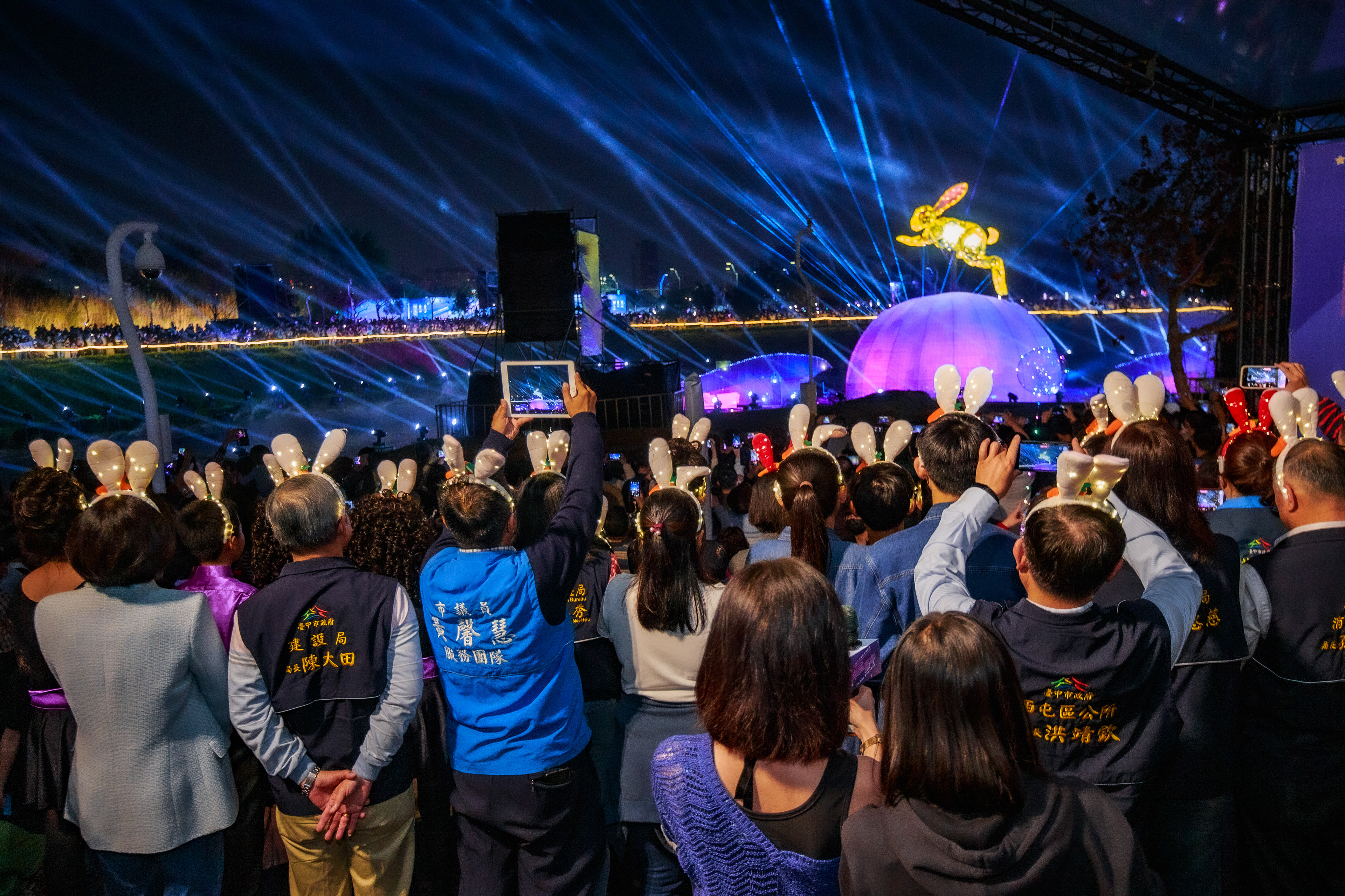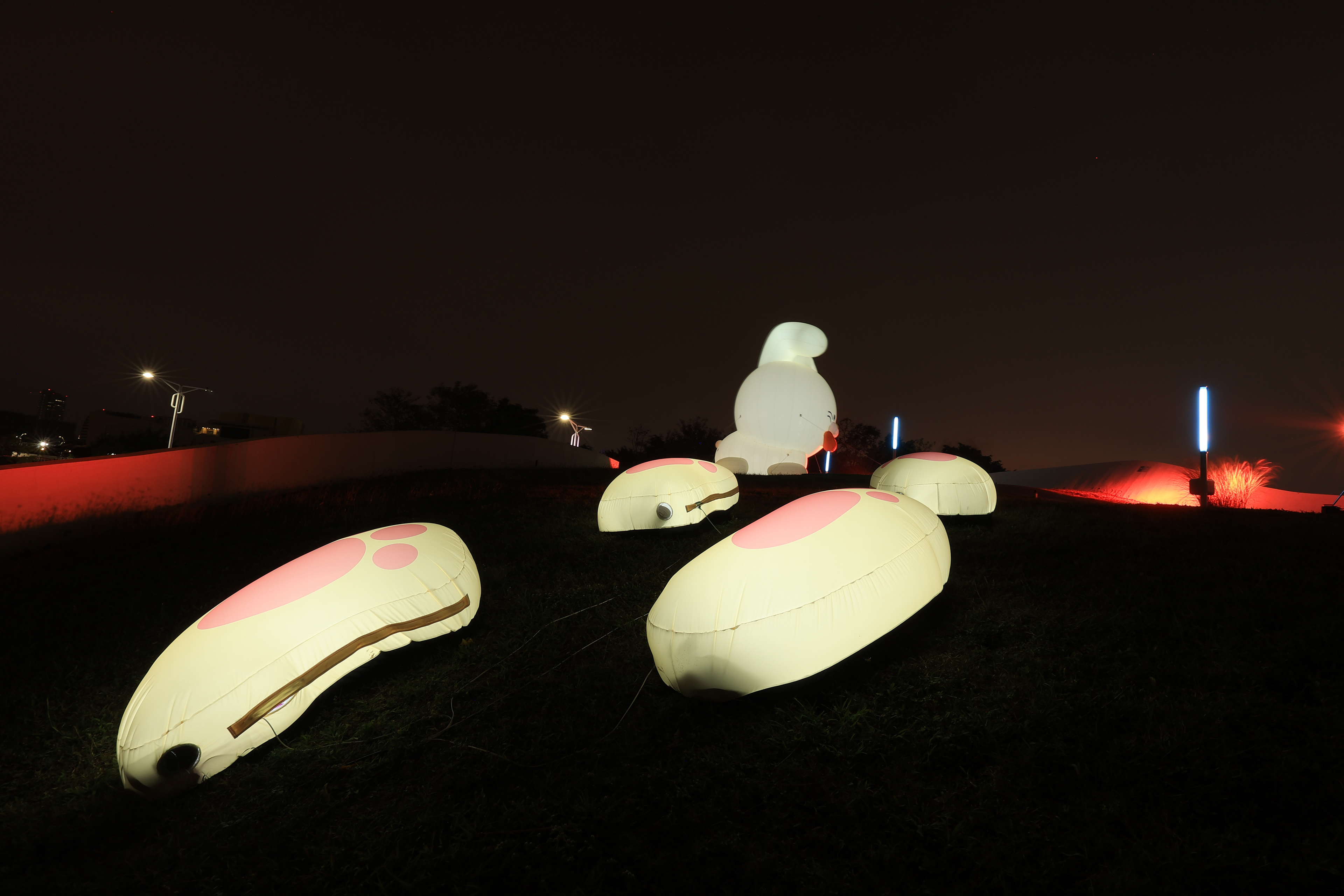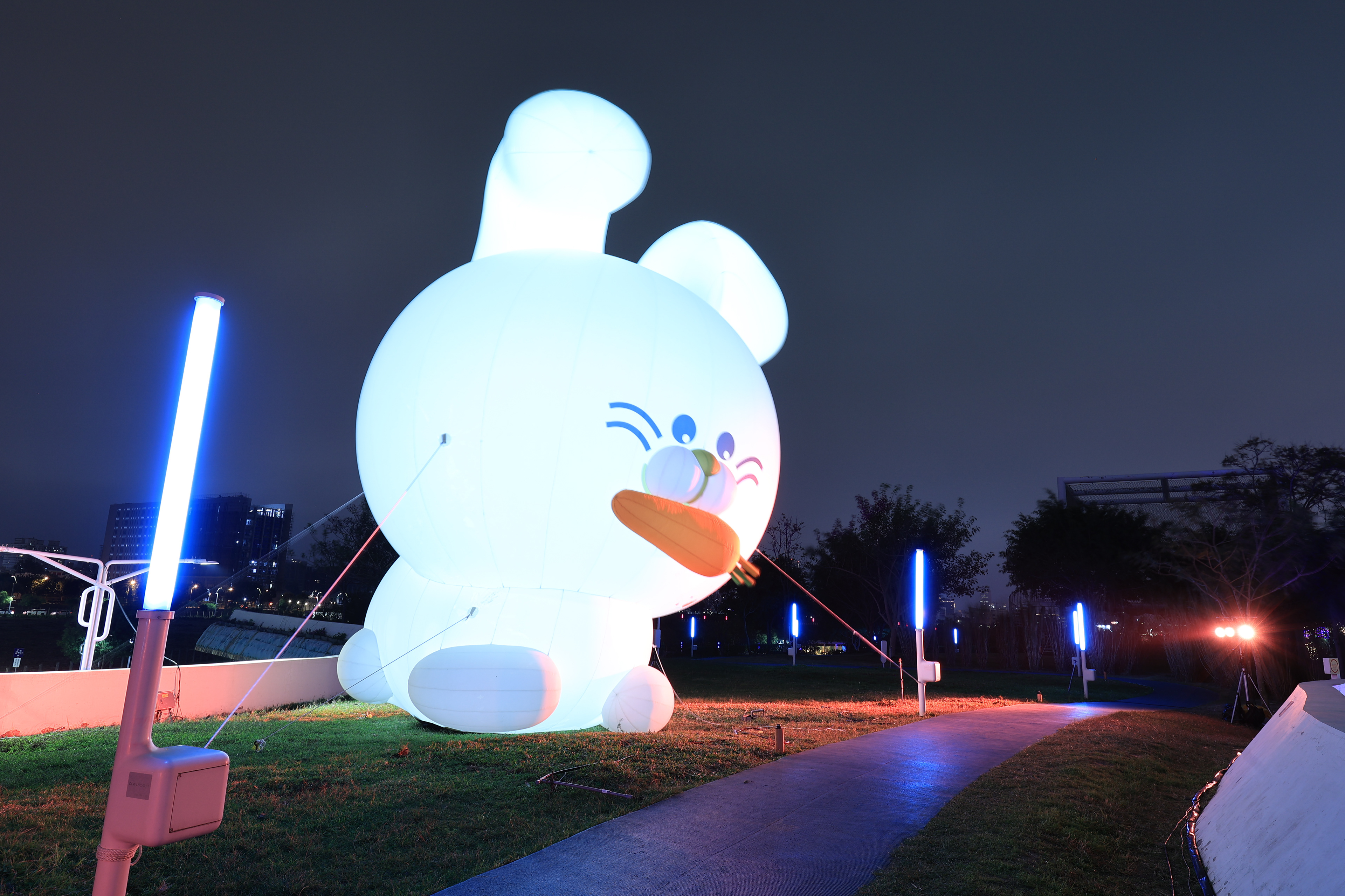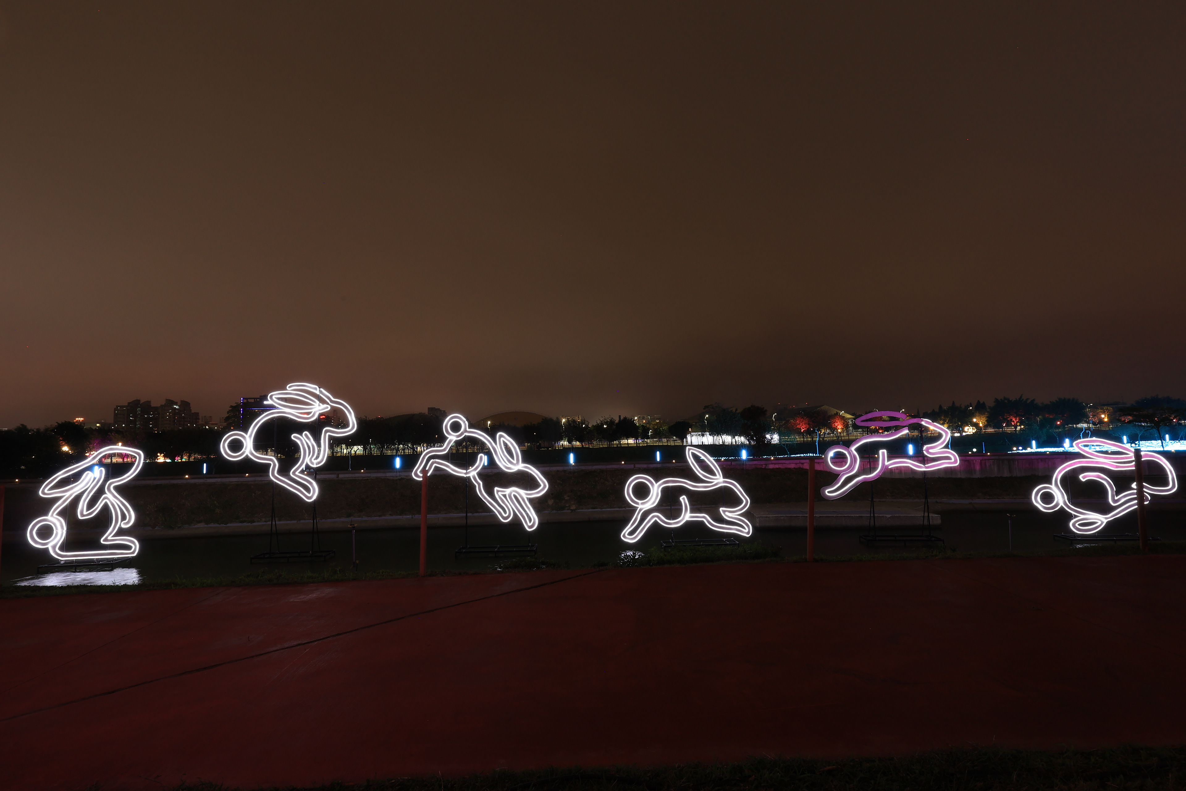 主燈「幸福臺中 Happy兔」,結合傳統紮燈工藝、科技藝術手法, 打造全臺規模最大的水上動態主燈! 主燈群以水上星球為中心,360°環景投影,搭配兩旁建築群高低錯落,隱約可見知名的中臺灣電影中心、國家歌劇院等建築,透過燈光色彩的層次烘托,象徵幸福臺中的城市意象 主燈秀「Happy兔」從星球內升起,靈活耳朵上下擺動,曲音高揚時,「Happy兔」昂首向上, 彷彿帶領大家邁向低碳、宜居、美好未來的城市光景。 6大主題燈區、逾30座燈組,以環境友善議題結合場域特色, 打造出專屬中央公園地形地貌的璀璨燈區; 白天是大型裝置藝術公園,夜晚則搖身變成耀眼花燈樂園。 The main lantern, "Happy Rabbit of Happy Taichung," combines traditional lantern-making craftsmanship with technological artistry to create Taiwan's largest dynamic floating lantern. Centered around a water planet, the lantern features 360° panoramic projections. Surrounding buildings, with their varying heights, subtly reveal landmarks such as the Central Taiwan Film Center and the National Taichung Theater. The layered lighting enhances the cityscape, symbolizing the happiness of Taichung. In the main lantern show, "Happy Rabbit" rises from within the planet, its ears playfully moving up and down. As the music crescendos, "Happy Rabbit" lifts its head, as if leading everyone toward a low-carbon, livable, and bright future city. With six themed lighting areas and over 30 light installations, the display integrates eco-friendly themes with the unique features of the Central Park landscape. By day, it is a large-scale art installation park, and by night, it transforms into a dazzling lantern wonderland.